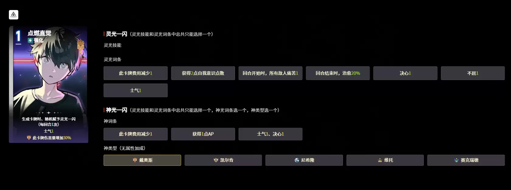 卡厄思梦境的牌组分为角色牌组和共用牌组两种,角色牌组由每个角色所特有,是玩家在对局中进行战斗所使用的主要卡组,有固定的出牌库,数值则与角色的等级、装备、属性等强绑定;而共用牌组是在对局中会随机刷新的各类卡片,分为业火种子、中立卡片和怪物卡片三种,有着不同的作用。点燃直觉是中立卡片中的一张强化卡,它的能力是可以在卡片生成时,为其中的随机一张赋予“灵光一闪”的效果,对卡片进行增强。虽然这张卡在每回合只能生效一次,生效的单位也只有一个,但其能带来的收益较高,是一张毋庸置疑的辅助强卡。