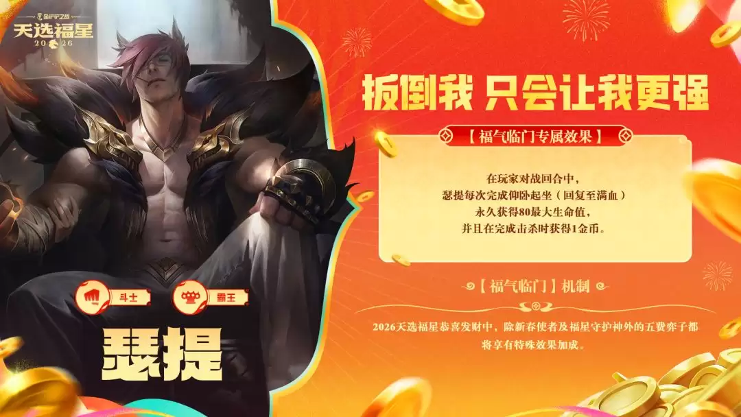 在《金铲铲之战》2026福星恭贺发财模式中,瑟提作为成长型的后期核心,开局时应优先合成法爆和正义两件套。前期可以利用3福星配合三国体系过渡,既能稳健攒经济,又能为后期转向福星九五阵容打下基础。中期快速上九人口,寻找二星瑟提。将瑟提放置在第一排,让他尽快触发仰卧起坐,起身后配合斗士的羁绊效果即可轻松锁血吃鸡。