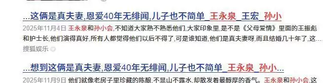 后来,王永泉熬出头了,成了圈内的大咖。在这个充斥着诱惑、今天出轨明天离婚的娱乐圈里,王永泉对孙小会的感情却几十年如一日,连一条花边新闻都没有过。