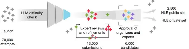 这套题的设计逻辑很残酷。每一道题提交之前,都要让 AI 先做一遍。如果 AI 做对了,这道题就不要。如果 AI 做错了,才会进入人工审核环节。审核要过两关,第一关是几个研究生水平的审稿人提意见,第二关是专家拍板。整个过程下来,1,000 个专家花费几个月,从几万道题里筛选出了这 2,500 道题。
