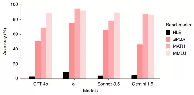 如前所述,MMLU 已经无法满足当前 AI 的发展。2020 年,MMLU 刚出来的时候,AI 只能考三四十分。到了 2024 年,GPT-4 直接飙到 86 分。现在,随便一个开源模型都能考到 90 分以上。当考试分数都溢出来了,如何测量 AI 的聪明程度呢?因此,得换一套更难的新卷子。