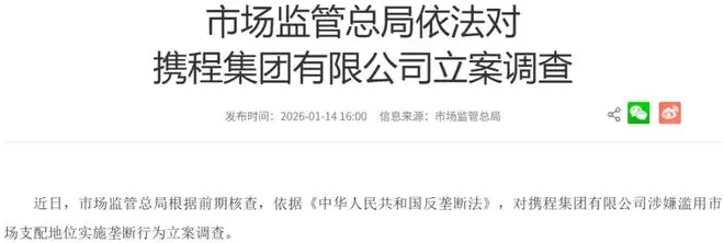 1 月 5 日,携程下线了用户端前台的“特牌”“金牌”视觉标识,但后台的分级合作规则、流量分配逻辑,与商家端未到期的合同仍正常执行;一周后的 1 月 14 日,国家市场监督管理总局正式发布公告,依据《中华人民共和国反垄断法》,对携程集团涉嫌滥用市场支配地位实施垄断行为立案调查。