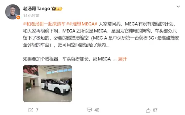 理想汽车产品线负责人汤靖近日在社交平台上明确表态,理想MEGA将不会推出增程式版本。这一决策源于该车型独特的纯电架构设计,其车头部分仅保留了必要的极短碰撞溃缩空间,以最大化车内可用空间。作为中保研首款获得3G+最高碰撞安全评级的车型,MEGA的这一设计特性直接决定了其无法兼容增程器。