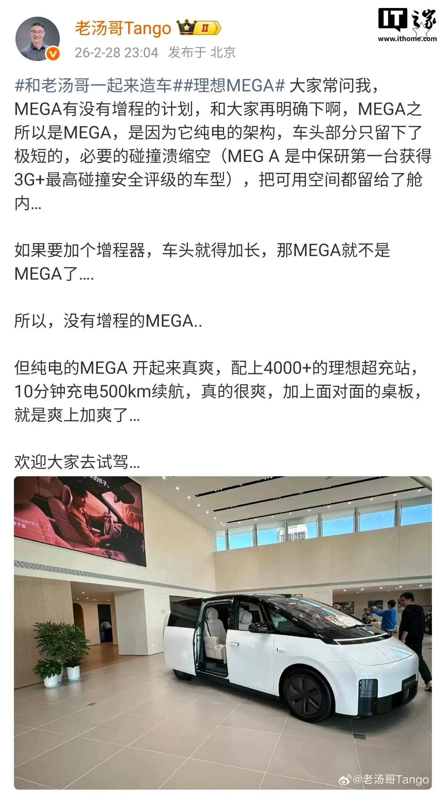 理想汽车产品线负责人汤靖近日明确表示,旗下纯电MPV车型理想MEGA将不会推出增程版本。据悉,MEGA基于纯电架构打造,其车头设计仅保留了极短的必备碰撞溃缩空间,从而最大限度地优化了舱内可用空间。若增加增程器,车头长度将被迫延长,这将改变车型的核心设计理念,因此最终决定保持纯电版本不变。
