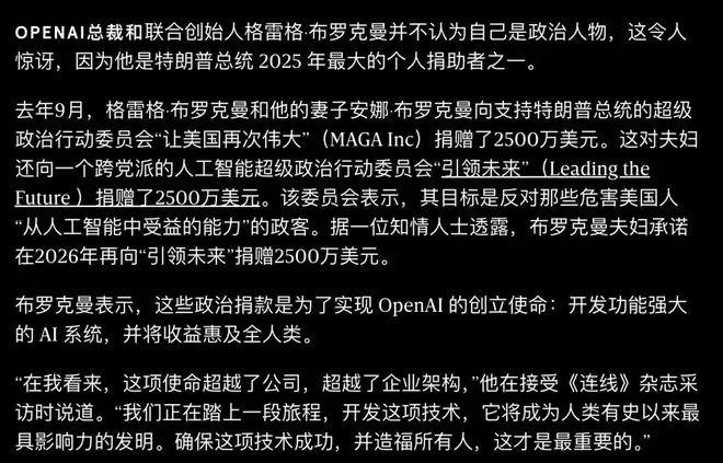 探讨 OpenAI 为何能奇迹般地避开本届政府的政治雷区,Greg Brockman 那笔巨额政治献金是根本无法绕开的隐秘核心。