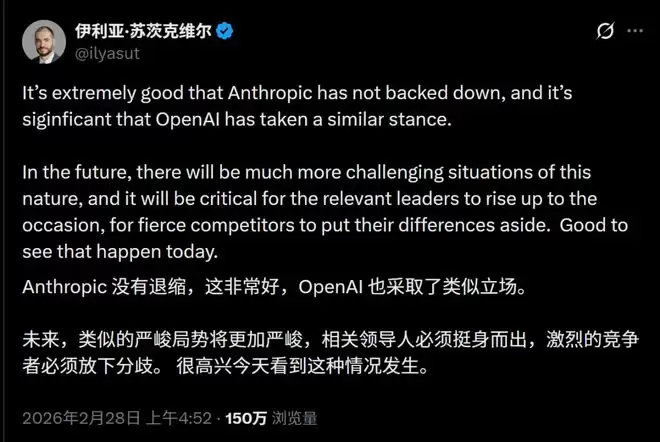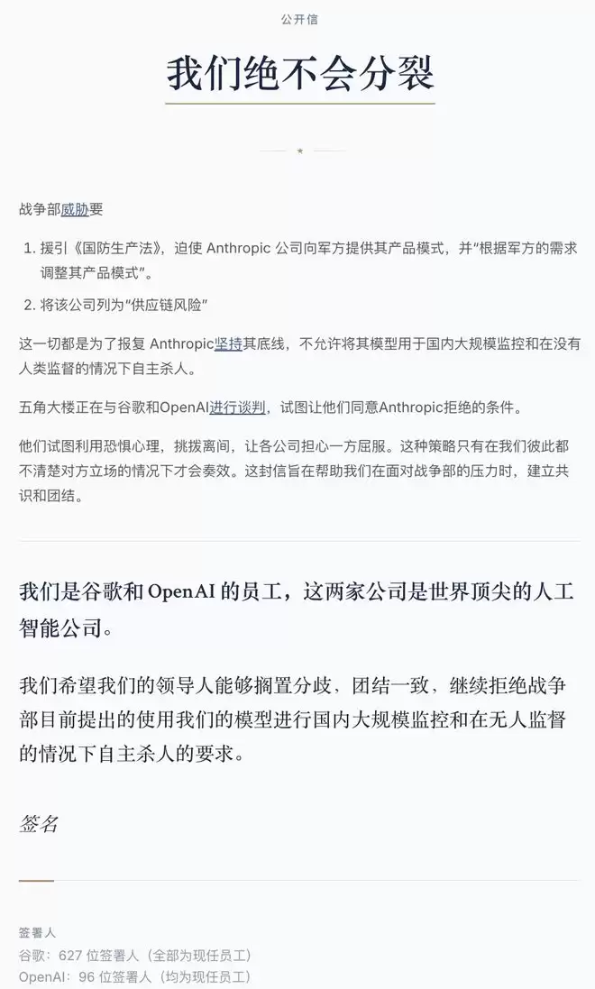 OpenAI 和谷歌的数百名员工纷纷站出来力挺 Anthropic,甚至签署了名为「我们绝不会分裂」的联名公开信,连久未露面的前 OpenAI 首席科学家 Ilya 都现身表达支持。