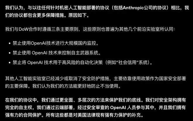 更令人愤慨的是,OpenAI 明明设立了完全相同的安全红线,仅仅通过强调「云端部署」来保障安全,就堂而皇之地抢到了美国战争部的订单。