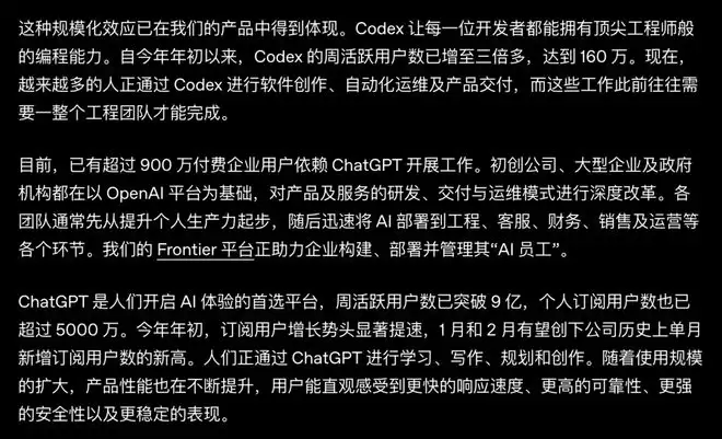 根据 OpenAI 最新公布的数据,ChatGPT 的周活跃用户数已突破9亿,个人订阅用户数超过 5000 万,更有超过 900 万付费企业用户依赖其开展工作,Codex 的周活用户也达到了 160 万。