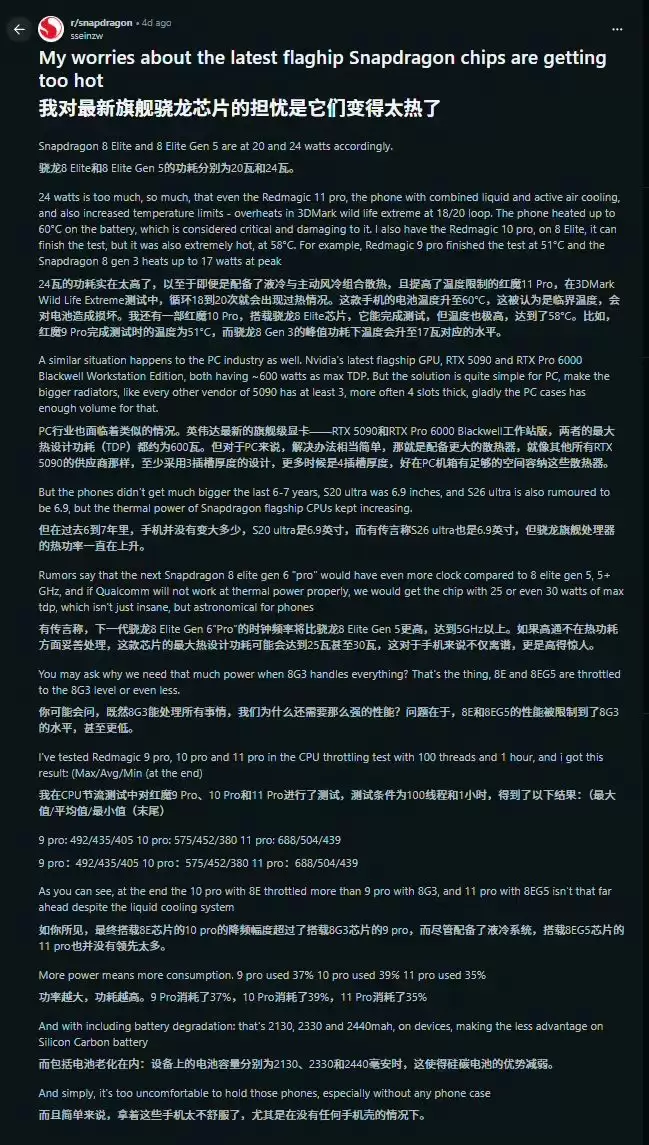 而且Reddit用户sseinzw的讨论已经炸了锅,原因是当手机芯片的功耗达到轻薄本级别,拿在手里的到底是手机还是暖手宝!