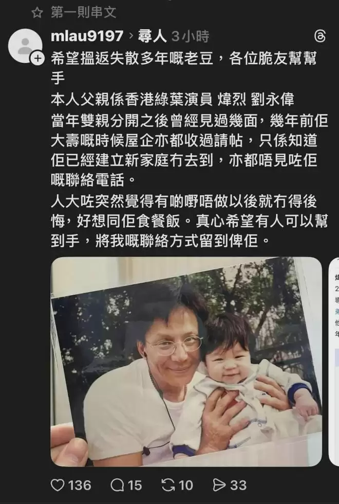 煒烈兒子突然網上尋父。(網上圖片)