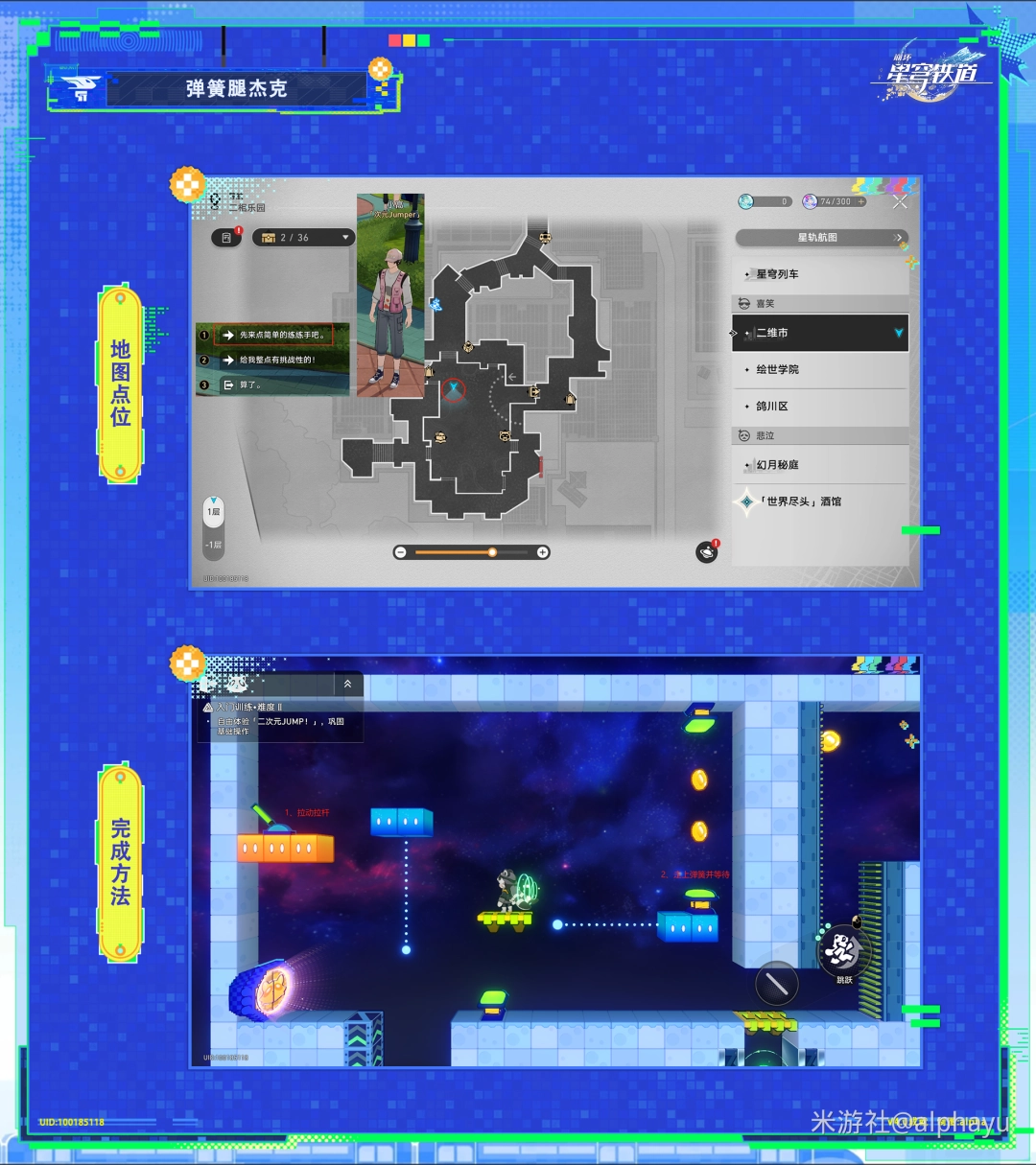完成方法:在「二次元JUMP!」入门训练的蹦床中来回弹跳10次。进入入门训练场景后,拉动拉杆使两个弹跳装置相对,走上弹跳装置并耐心等待,即可完成此成就。