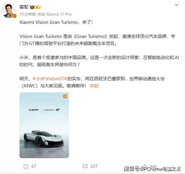 在西班牙巴塞罗那举行的MWC展会即将迎来一款备受瞩目的新车型——小米Vision Gran Turismo实车。小米集团创始人、董事长兼CEO雷军通过社交平台正式宣布了这一消息,引发了汽车行业和科技爱好者的广泛关注。