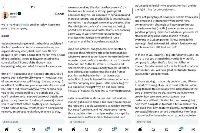 几小时内,一封写给全员的内部信被多家媒体核实转述。Block将裁员超过4000人,员工规模从10000多人降到不足6000人,接近半数岗位在同一天被重新安排。