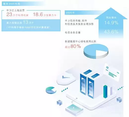中卫是宁夏算力产业的核心区。2024年以来,随着人工智能快速发展和“东数西算”工程深入推进,企业投资需求激增,中卫算力产业再次驶入“快车道”。中卫市数据局副局长任涛说,截至2025年底,中卫已上线运营23万个标准机架、18.6万张算力卡,算力规模达到13万P(1P约等于每秒1000万亿次计算速度)。