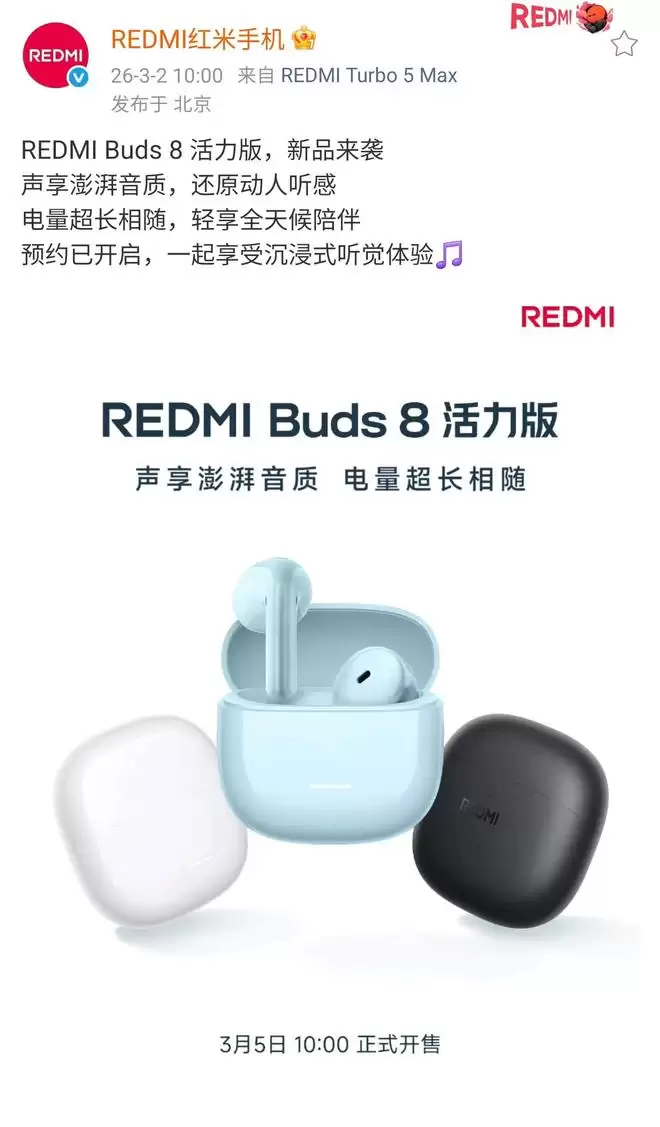 据IT之家3月2日消息,小米今日正式宣布Redmi Buds 8活力版耳机将于3月5日上午10点正式开售。最新公布的海报显示,这款耳机将提供黑、白、蓝三种配色供用户选择。