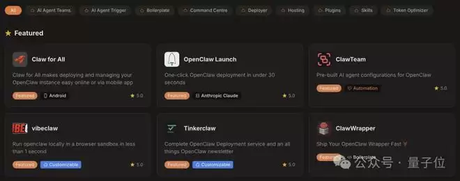 AI Agent Teams(Agent团队协同工作方案)、AI Agent Trigger(触发Agent执行任务的机制/工具)、Boilerplate(代码模板)、Command Centre(控制面板)、Deployer(部署工具)、Hosting(托管服务)、Token Optimizer(Token优化工具)、Skills(扩展特定功能的技能模块)、Plugins(增强OpenClaw能力的插件)。