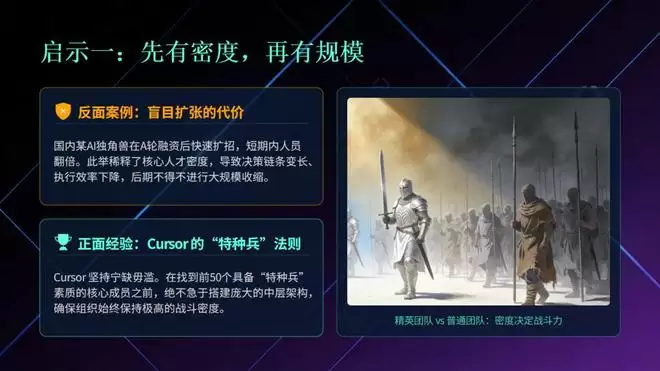 Cursor的经验是:在找到前50个“特种兵”之前,不要急着搭建庞大的中层架构。宁缺毋滥,是AI时代的第一招聘法则。