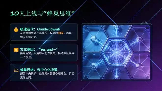 没有瀑布模型,没有复杂规范。所有人围坐在“篝火”旁,围绕一个鲜活的原型即兴表演。内部文化基因是“Yes, and…”——每个想法都会被接纳、审视,由“蜂巢思维”来评判。没有中央决策机构拍板,当魔法发生时,大家同时心领神会。
