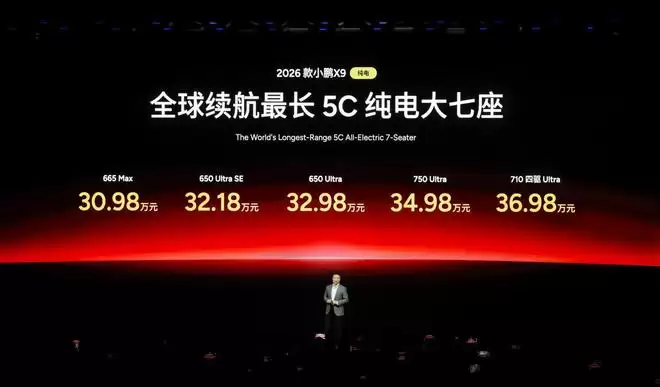 此外,本次发布的2026款小鹏X9纯电版新车共推出5款版型,包括665 Max、650 Ultra SE、650 Ultra、750 Ultra以及710四驱 Ultra,最新指导售价分别为30.98万元、32.18万元、32.98万元、34.98万元及36.98万元。此次焕新,还带来了2026款小鹏X9增程版1602 Ultra SE,最新指导售价为32.18万元。