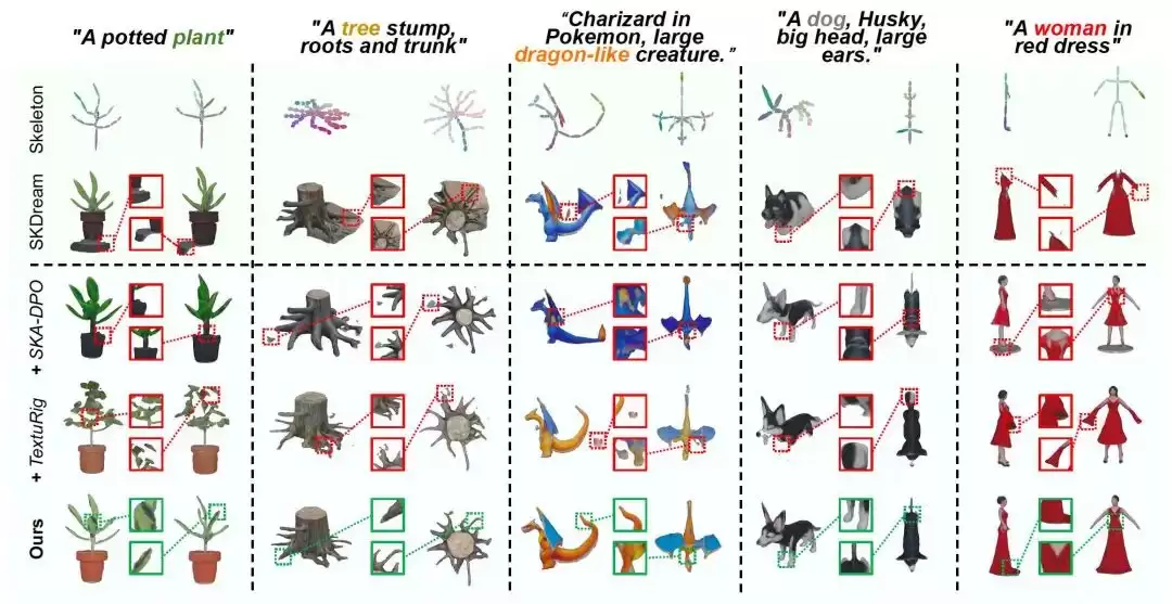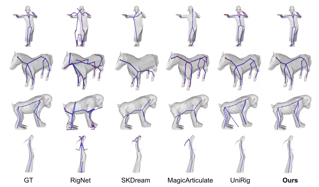 将骨架生成结果与RigNet、SKDream、MagicArticulate和UniRig进行了比较。