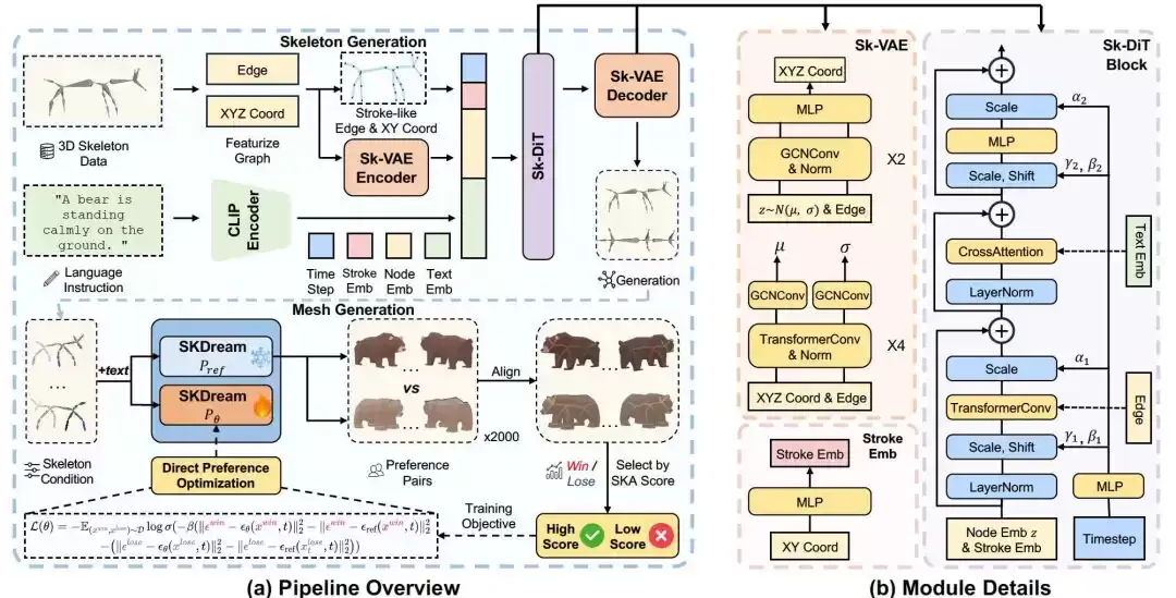 为了解决这些局限性,论文提出了一个全新框架Stroke3D,它能够直接从用户输入(2D绘制的笔触和描述性文本提示)生成绑定网格。方法开创了一种两阶段流程,将生成过程分为:可控骨骼生成,采用骨骼图VAE(Sk-VAE)将骨骼的图结构编码到一个潜在空间中,其中骨骼图DiT(Sk-DiT)生成骨骼嵌入。生成过程同时依赖于文本的语义信息和2D笔触的显式结构控制,VAE的解码器重建最终的高质量3D骨骼;通过TextuRig和SKA-DPO增强网格合成,在此基础上合成纹理网格。在此阶段,首先使用TextuRig数据集(一个包含纹理和绑定网格以及说明文字的数据集,来自Objaverse-XL)扩充现有骨骼到网格模型的训练数据,从而增强其性能。此外采用基于骨骼-网格对齐评分的偏好优化策略SKA-DPO,以进一步提高几何保真度。该框架为创建可直接用于动画的3D内容提供了更直观的工作流程。