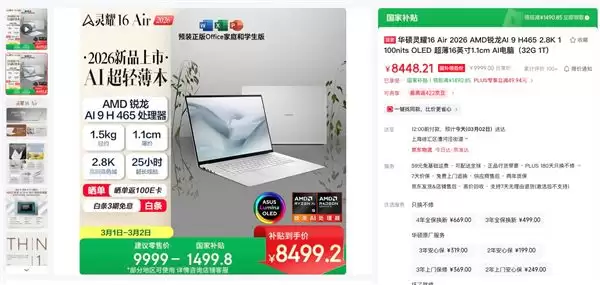 目前,华硕灵耀16 Air 2026在电商平台火热售卖中,售价9999元,部分地区可享至高1499.8元国家补贴,到手8499.2元起,还支持白条3期免息,而且晒单返100E卡。