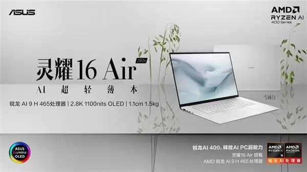 华硕灵耀16+ Air 2026评测:1.5kg超轻薄AI本搭载锐龙AI 9