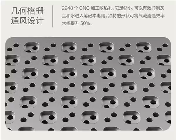 此外,散热系统的升级进一步保障了性能释放:内置双风扇+超薄均热板,C面上方创新采用几何格栅设计,2948个CNC精密加工的微型散热孔,既能快速导出机身内部热量,又能有效阻挡灰尘与水滴进入。
