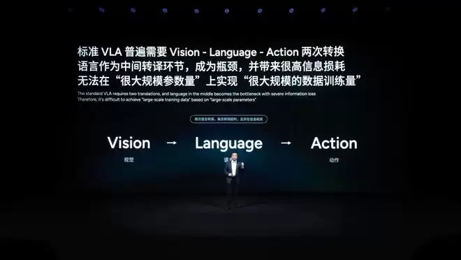 何小鹏认为,VLA 路线本身,依然脱胎自人类对「模型可解释性」的需求,也就有了从 Vision 视觉到 Language 语言,再从语言到动作的两层转译。