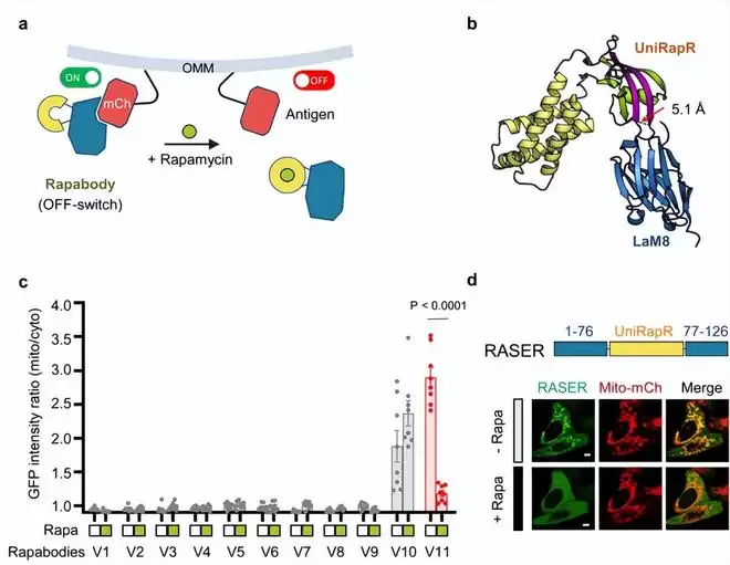既然咖啡因能被打开,那么能不能关上?他们又做了另一个名为雷帕霉素体的系统,即把一种叫做 UniRapR 的模块插进纳米抗体里,这个模块本身是会响应雷帕霉素的,而平时会和另一种蛋白结合。该团队筛选出了一个变体,发现当雷帕霉素存在的时候,纳米抗体反而会松开它抓取的那个荧光蛋白。从加药到松开,只需要 20 多秒。