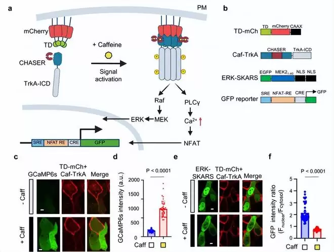 该团队在细胞膜上挂了那个荧光蛋白,咖啡体带着激酶在细胞质里转悠。咖啡因一来,咖啡体就会带着激酶跑到膜上,激酶聚集激活之后,下游的钙离子信号和 ERK 信号通路都亮了。