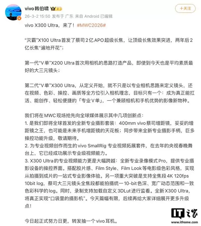 IT之家3月2日消息,vivo产品经理韩伯啸今日通过微博发文,详细解读了即将亮相的X300 Ultra手机的核心升级点。新机将从视频、色彩、操控、画质等多个维度引入专业的相机理念,目标是打造一款能够胜任“专业V单”(视频拍摄)任务的旗舰设备。