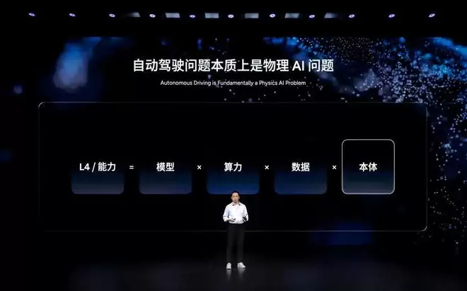 他表示,自动驾驶问题本质上是物理AI问题,L4能力=模型x算力x数据x本体。