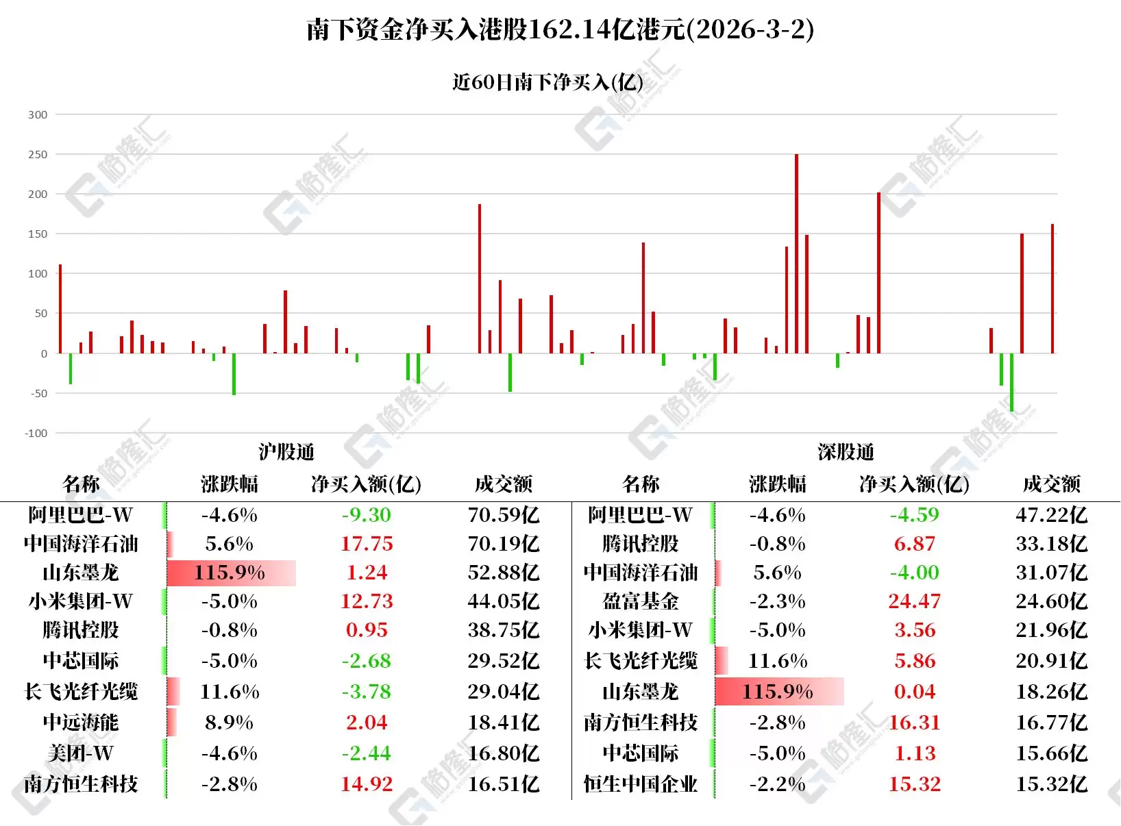 南下资金在今日(3月2日)的港股市场中持续买入,全天净买入额为162.14亿港元。具体资金流向如下:
