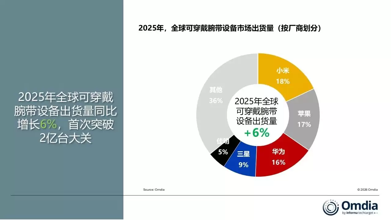 根据Omdia最新发布的市场研究报告,2025年全球可穿戴设备出货量预计将突破2亿台,较上一年增长6%。在这场激烈的市场竞争中,小米自2020年以来首次重返榜首,凭借18%的市场份额,成为全球年度出货量最大的可穿戴设备厂商。