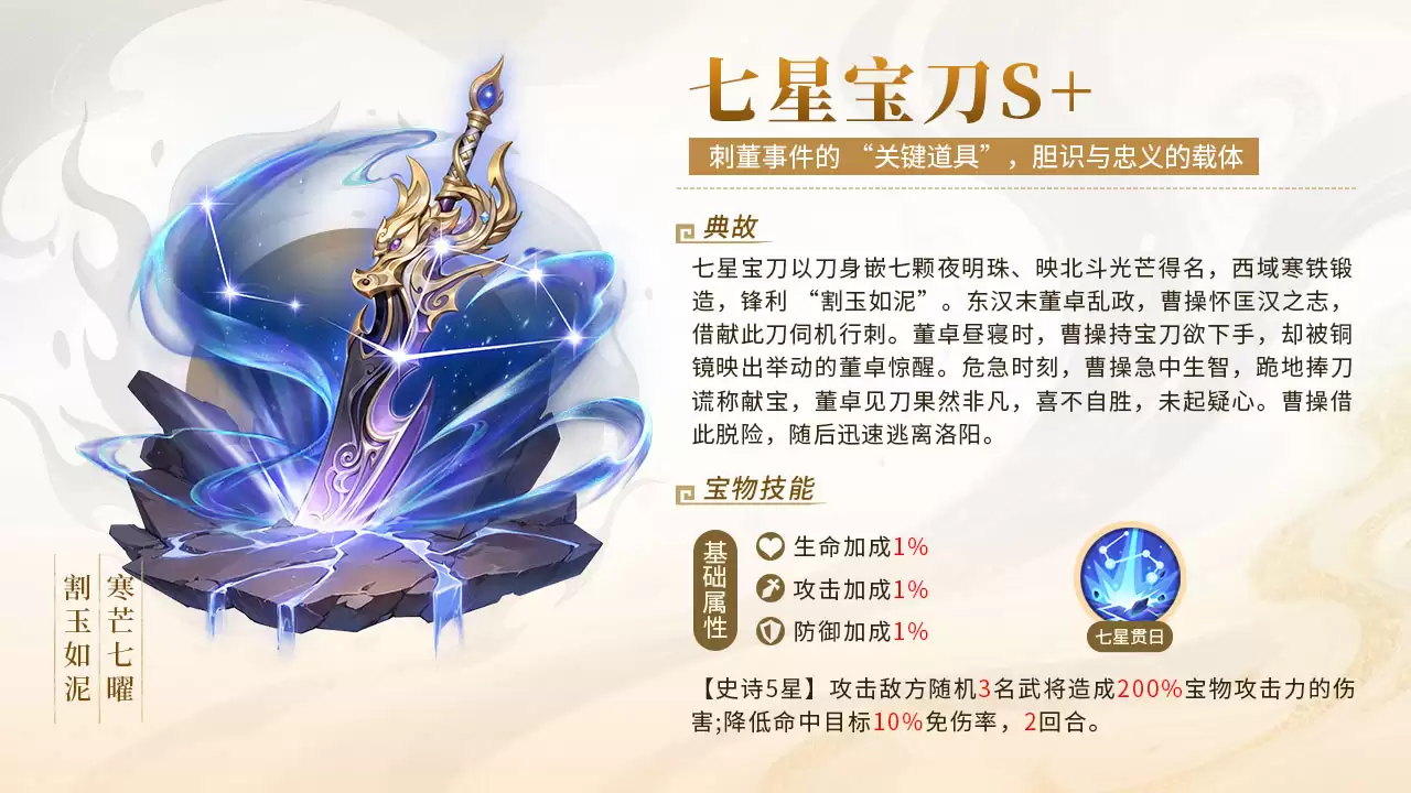 同为S+品质的“七星宝刀”则是战斗型武将的首选。这件阵营商物是“曹操刺董”事件中的关键道具,象征着胆识与忠义。装备它的武将同样可以获得1%的基础属性加成,并开启名为“七星贯日”的强大伤害技能。该技能能够使敌方随机三名武将持续受到200%的宝物攻击力伤害,是一个非常强力的群体攻击技能。如果宝物等级足够高,能够在实战中实现快速的血线压制和斩杀效果。同时,此宝物还能使敌方的免伤率在两回合内降低,让我方武将的伤害输出效率更高。此外,游戏中还有传国玉玺、七星灯等其他宝物,它们高度匹配以防御和治疗为主的武将,应用场景也非常广泛。