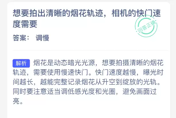 支付宝蚂蚁庄园2026年3月2日答案:拍清晰烟花轨迹的相机快门速度