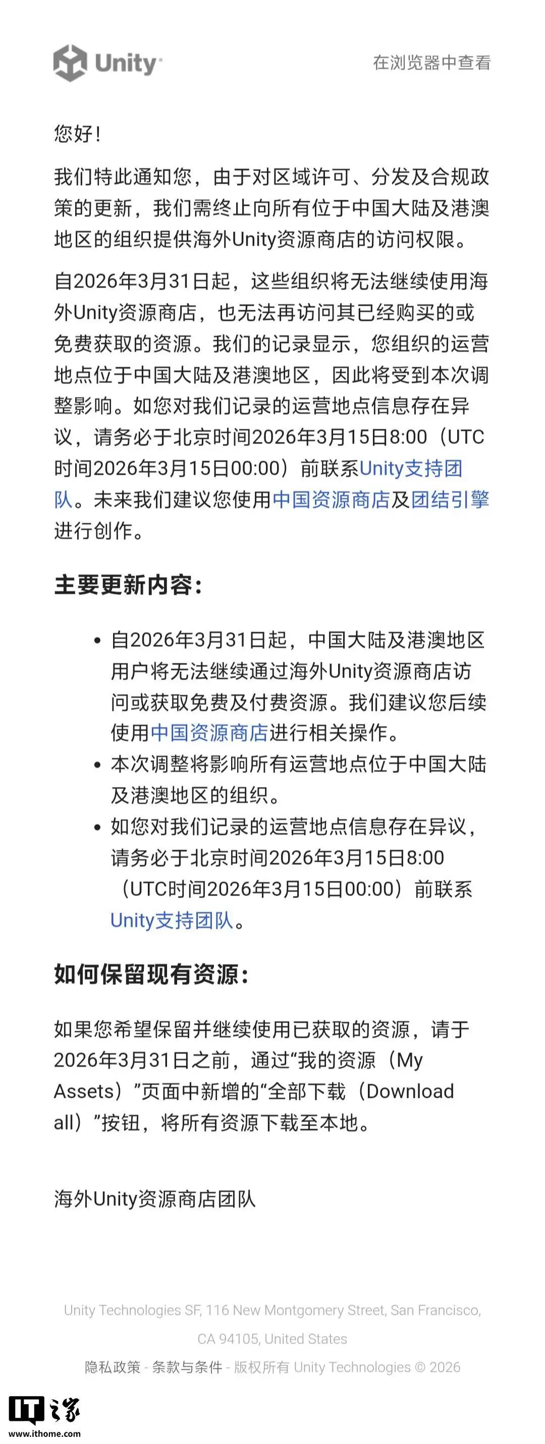 3月3日,多位IT之家的小伙伴向我们反映,他们今天收到了来自海外Unity资源商店团队的邮件通知。邮件明确指出,由于区域许可、分发及合规政策的更新,团队决定终止向所有位于中国大陆及港澳地区的组织提供海外Unity资源商店的访问权限。