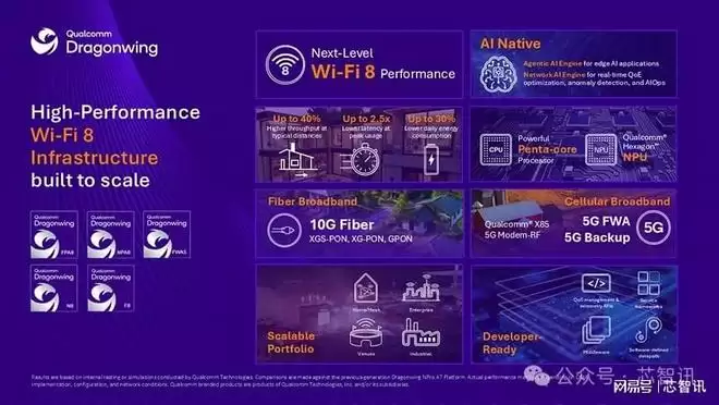 高通科技的Wi-Fi 8龙翼网络平台建立了一类新型网络基础设施,将路由器、宽带网关和企业接入点提升为AI原生系统,具备智能高性能无线网络。该作品集包括: