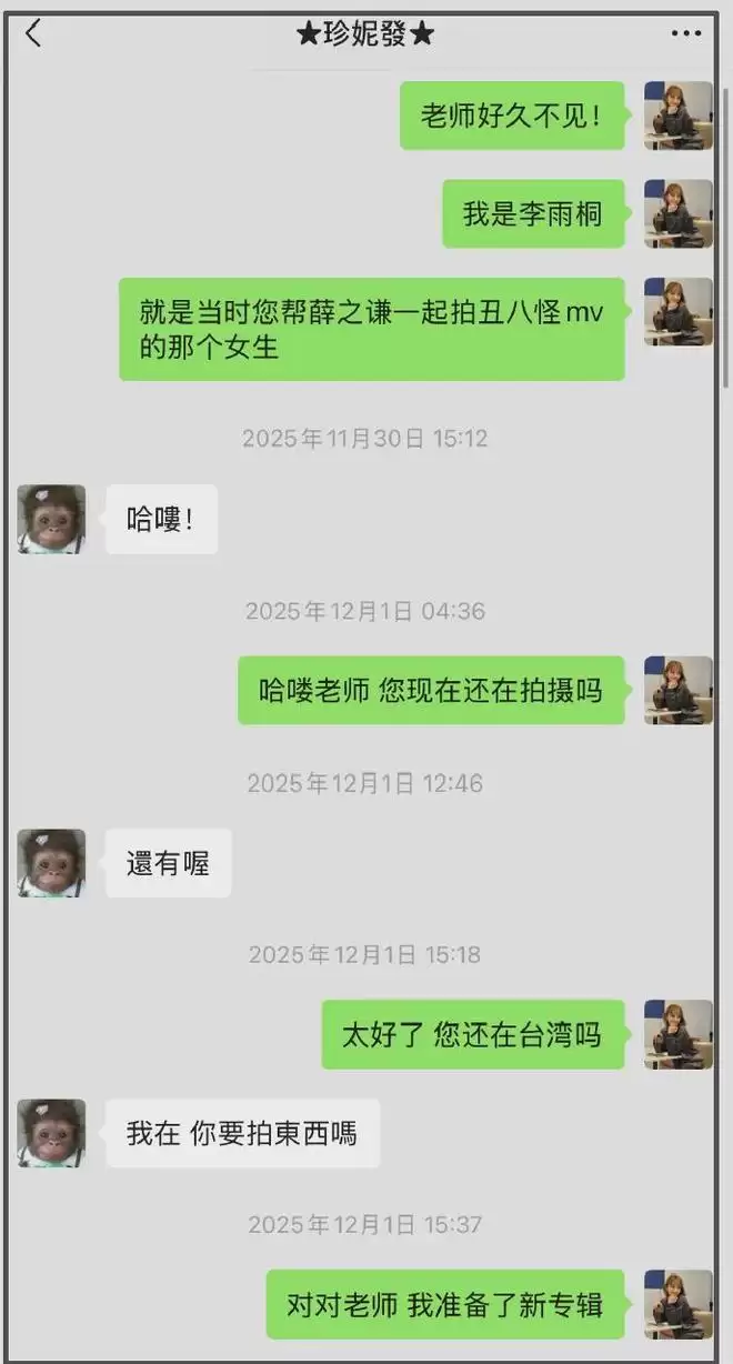 李雨桐还晒出了跟珍妮花导演的聊天记录,证实自己当年参与了《丑八怪》MV的拍摄。她称当时导演让薛之谦叫她拍,只有胡彦斌、王嘉尔、赵丽颖、杜江霍思燕为她鼓掌,而薛之谦表面奉承私下变脸,还暗自吐槽周杰伦喜欢混血脸。