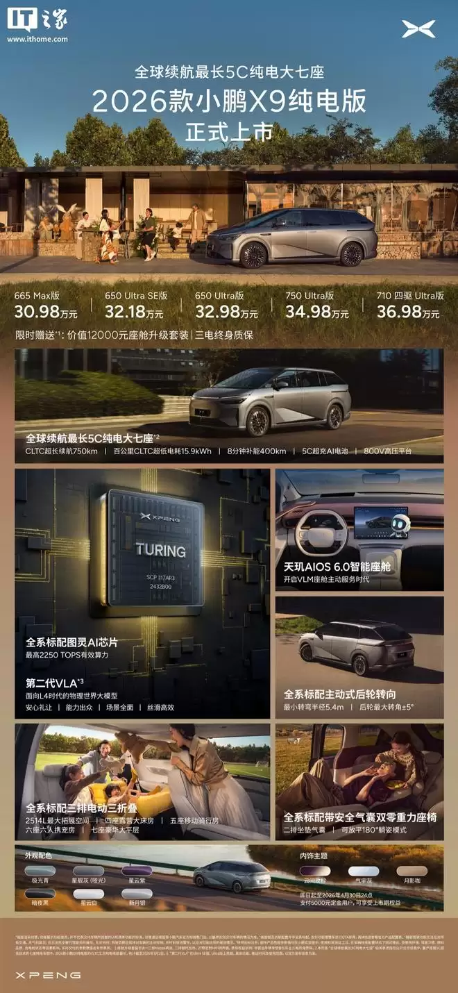 此外,2026款小鹏X9纯电版MPV也在昨日正式上市,这款被誉为"全球续航最长的5C纯电大七座"车型标配5C超充技术,百公里综合电耗仅15.9kWh,CLTC续航里程达750公里。全系标配图灵智能芯片,最高算力可达2250TOPS,起售价为30.98万元。