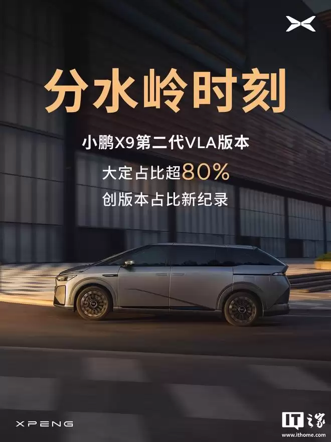 IT之家3月3日消息,小鹏汽车今日公布了重要里程碑:3月2日第二代VLA智能驾驶系统发布后,小鹏X9搭载第二代VLA的版本订单占比突破80%,刷新了版本占比的新纪录。