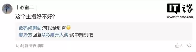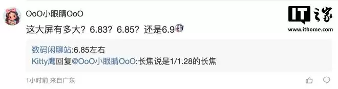 随后有用户在评论区询问:"这个主摄好不好?",博主回复道:"可以给到顶[滑稽]";另一名用户则询问道:"这大屏有多大?6.83?6.85?还是6.9[二哈]",博主则回复道:"6.85左右"。
