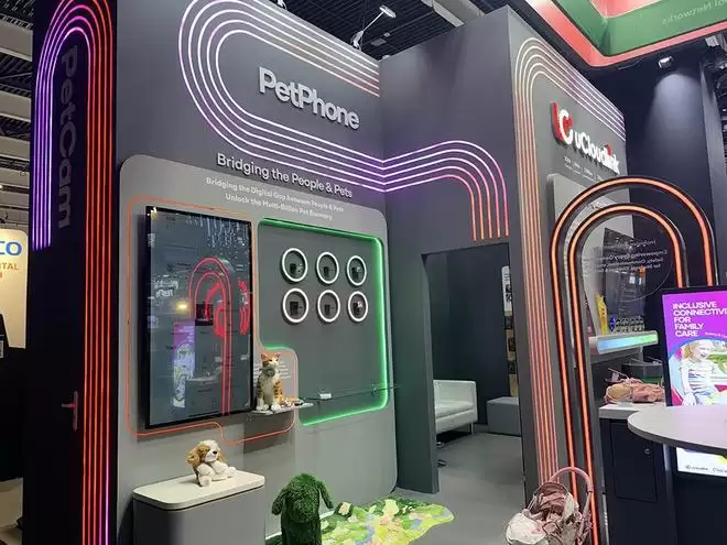 在优克联展台,你可以体验到宠物手机Pet Phone。这个手机可以夹在宠物项圈上,方便你跟宠物互相打电话。