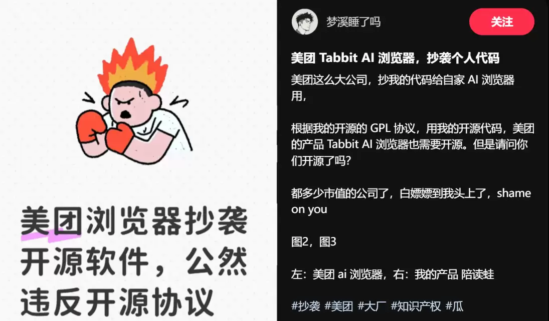 3月3日,有网友“梦溪睡了吗”在社交平台发帖爆料,称美团推出的AI浏览器Tabbit涉嫌抄袭其个人产品“陪读蛙”的源代码,并贴出了两款产品界面的对比图。