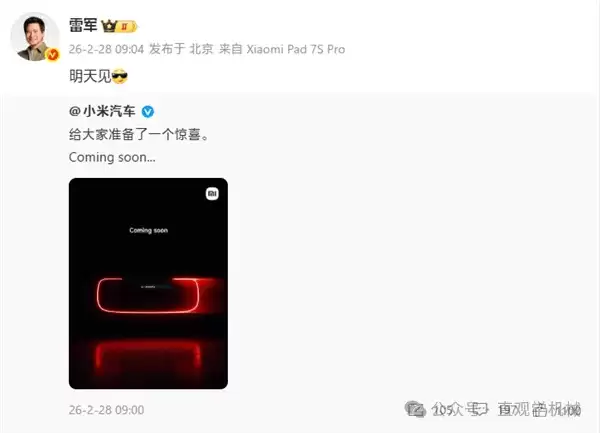 小米汽车最近动作频频,先是发布预热信息,声称“为大家准备了一个惊喜”,随后创始人雷军在社交平台宣布,3月1日将有重要消息公布,引发外界广泛猜测。