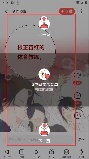 8、调出菜单后,可实现上下话的切换操作,能向作者打赏,可开启自动播放模式,也能切换至夜间观看模式,同时还支持发送弹幕互动。