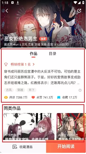 6、在详情页,能查阅作品的详细介绍、目录详情,还能浏览同类作品推荐,也可将该漫画加入收藏。