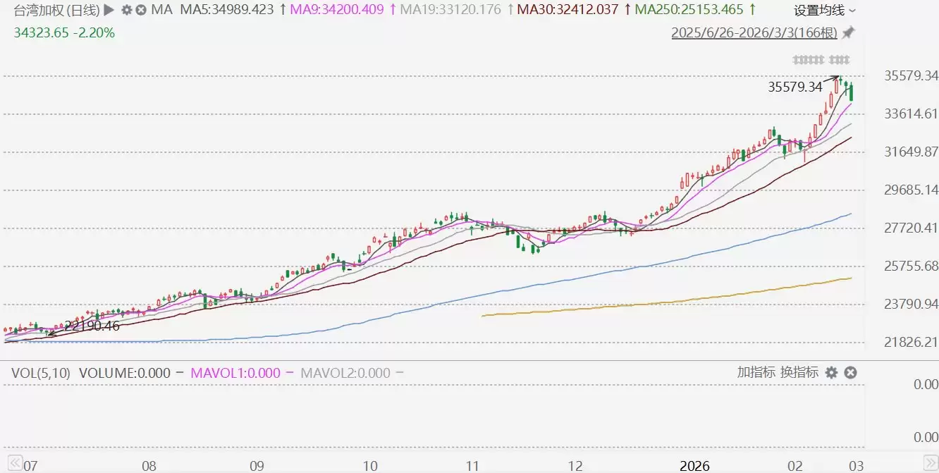 台湾加权指数3月3日收盘下跌771.44点,跌幅2.2%,收报34323.65点。