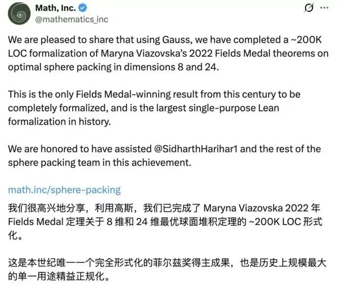菲尔兹奖成果首次AI化:高斯20万行代码重构数学史